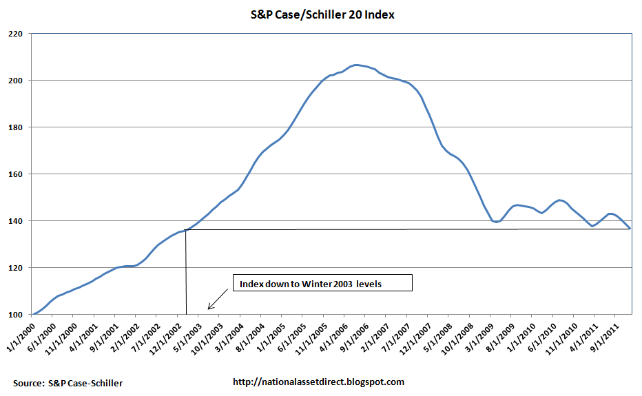 “After a prior three years of accelerated decline, the past two years has been a story of a housing market that is bottoming out but has not yet stabilized. Up until today’s report we had believed the crisis lows for the composites were behind us, with the 10-City Composite originally hitting a low in April 2009 and the 20-City Composite in March 2011. Now it looks like neither was the case, as both hit new record lows in December 2011. The National Composite fell by 3.8% in the fourth quarter alone, and is down 33.8% from its 2nd quarter 2006 peak. It also recorded a new record low.”