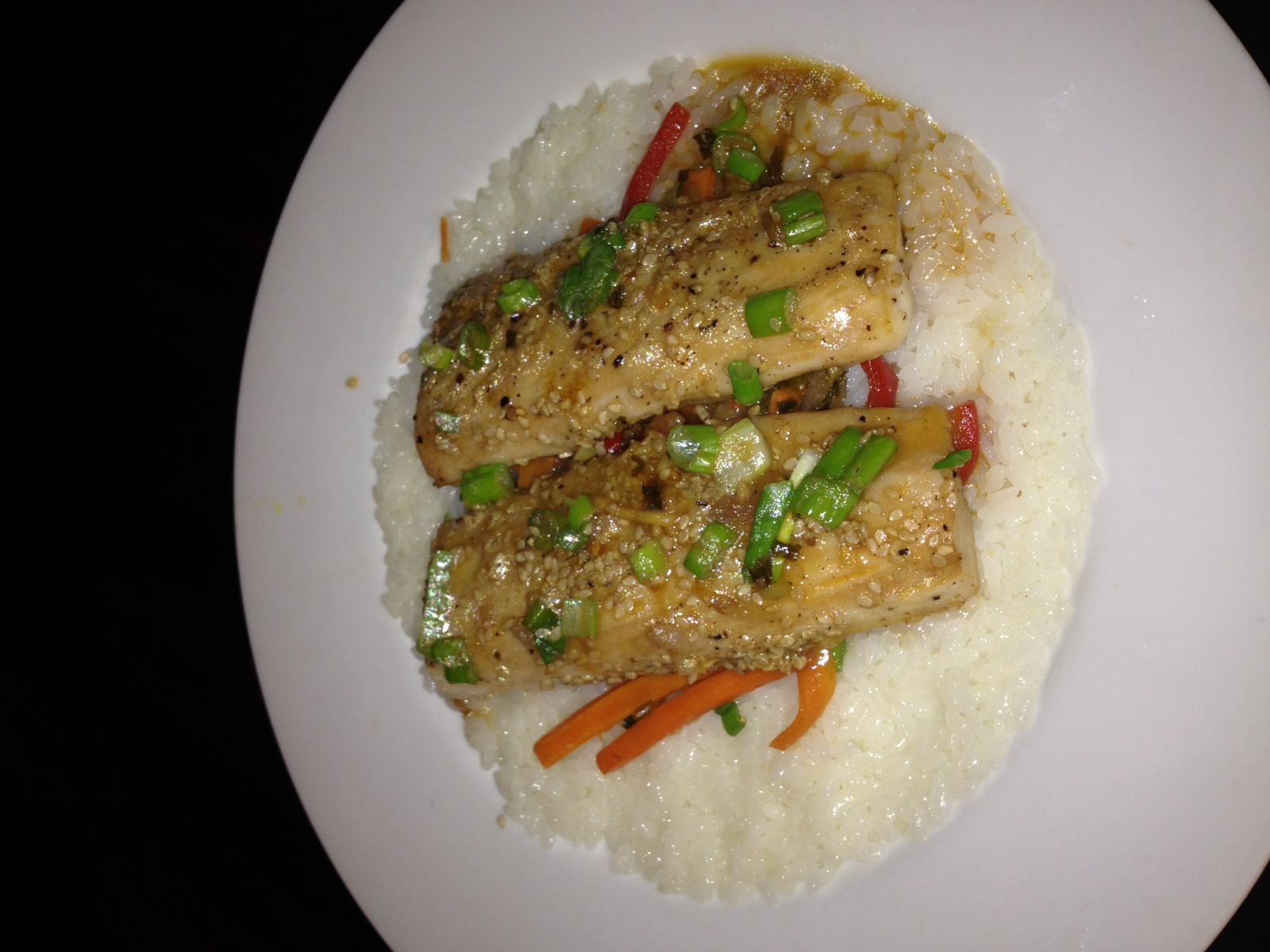 6. Time to plate! Coat a plate with rice. Sticky rice or sushi rice is particularly good. I like doing a thin round on the plate as a base. Then place a portion of vegetables on the rice, followed by one service of fish. Coat the fish with sauce and serve.