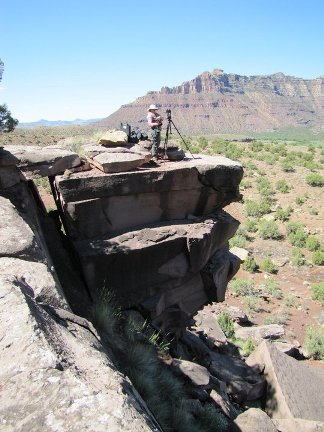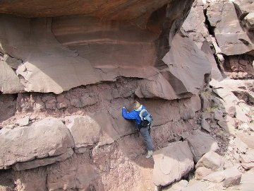 The second trip was at the end of August last year and she and Chelsea, her river guide for all three of her trips, spent 21 days in the baking sun (average temp of 100). The raft above is packed for two people for 21 days. Her site is only accessible by rafting down the Green River for three days and then another full day rafting out. They spent some time directly across the river photographing the outcrop with a gigapan system and visiting a natural spring where they were able to acquire fresh water to bring back to camp for purification. They set up a secondary camp near the old McPherson Ranch and spent a couple of nights there. The rest of the time they spent hiking up “her mountain” and while Chelsea found a shady spot to read, our daughter “worked the channels”. Chelsea was there just in case of accident or injury as the site itself is several miles from camp across a large meadow and then up. Even with really good walkie-talkies it would still take someone a couple hours to get from camp to the research site so Chelsea was her shadow in the field.