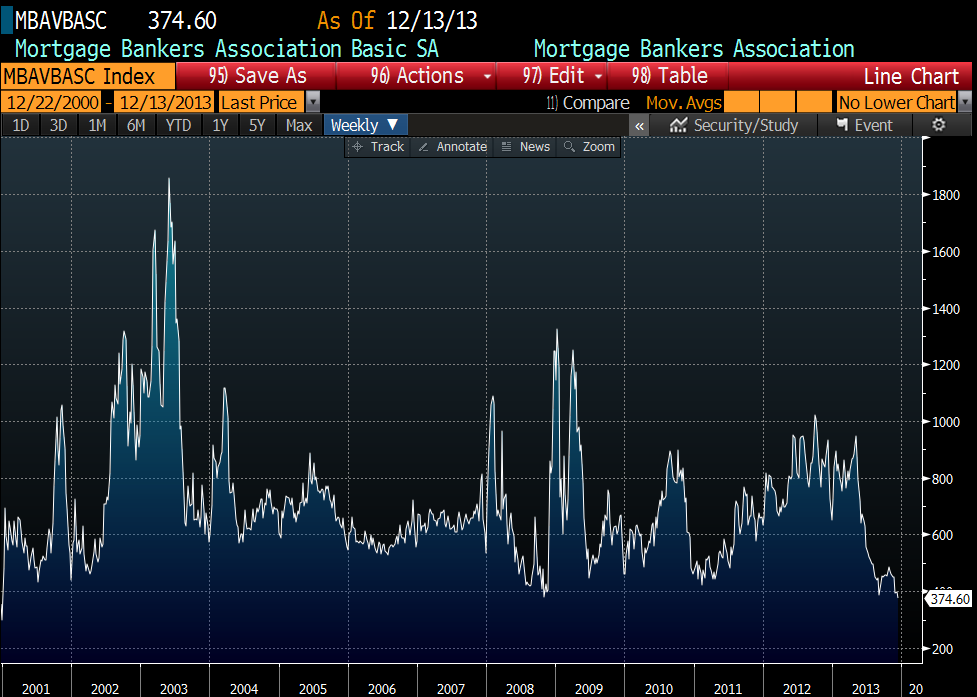 The bad news: Mortgage Applications hit the lowest level since 2001 last week as the MBA index dropped 5.5% to 374.60, the lowest level since 2001.