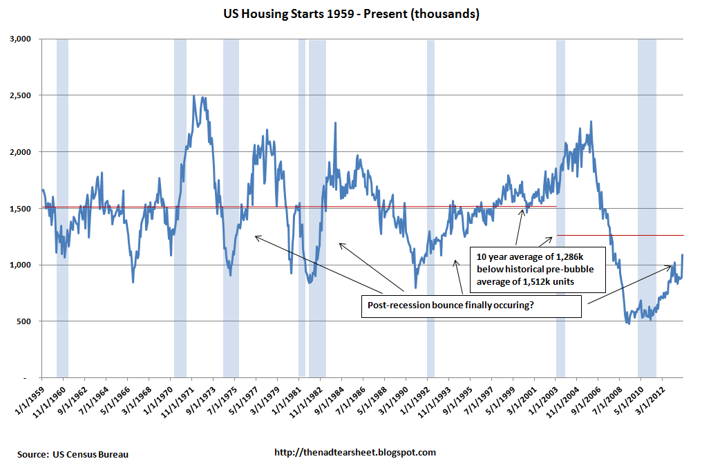The good news: In the “been down so long everything looks up” category, housing starts leaped to the highest level since early 2008, with a print of almost 1.1 million units. While it is historically a very depressed number, (we averaged about 1.5 million units a year prior to the bubble years), it looks great compared to our average of 727k over the past 5 years. Housing construction has been the Achilles Heel of this recovery – it is a huge economic engine and employs a lot of people. The builders have been reporting massive gross margins, and I think will want to start ringing the register.