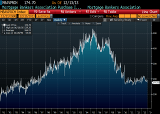 Here is the purchase index going back to 1991: We remain mired in this situation where cash buyers are almost half of all sales on purchase transactions and refis remain depressed. Will it turn around? Of course, once the first time homebuyer gets back on his or her feet.