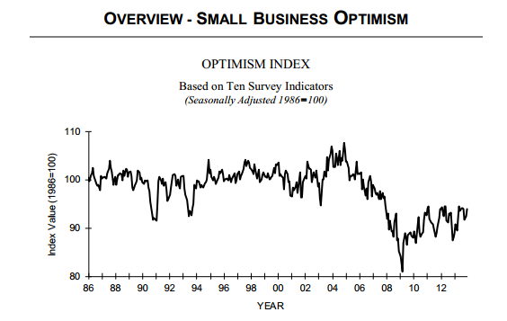 The National Federation of Independent Business optimism survey came in at 93.9, a little better than expected, and just short of the post-crisis peak of 95.4. Still, that number is depressed compared to historical norms. Pre-recession, the index averaged around 100, and numbers in excess of 100 are typical for recoveries. The theme of the this recovery has been the tale of two sectors. The big S&P 500 names have been benefiting from QE and their international exposure, while smaller businesses have not. It is hard to imagine that we can be flirting with record highs on the S&P 500 while smaller business remains in the doldrums. On the plus side, we are seeing some hiring – NFIB owners increased employment by an average of .24 workers per firm in December, the highest reading since Feb 2006. Capital expenditures also increased by 9 percentage points. So not all the news is glum.