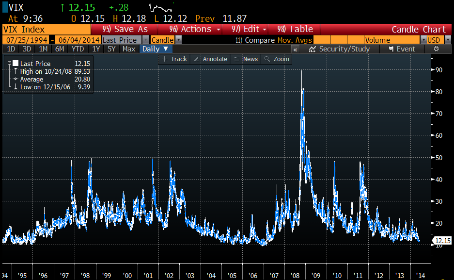 The calm before the storm? The Fed is worried about complacency in the markets. The VIX index has gone 74 straight weeks below its long-run average, which is a similar environment to 2006 – 2007. Junk spreads are widening, and junk issuance is growing as investors reach for yield. William Dudley commented: “Volatility in the markets is unusually low… I am a little bit nervous that people are taking too much comfort in this low-volatility period. As a consequence, they’ll take more risk that really what’s appropriate.” For what its worth, I think the VIX is useful for describing what has already happened in the market, not as a predictor of what is going to happen. Yes, there is the old market saw of “VIX is high, time to buy, VIX is low, time to go,” but a low VIX doesn’t necessarily mean markets are going to fall out of bed – look at the low VIX levels in 94-95, which preceded the mother of all stock market rallies. VIX invariably spikes AFTER the fit hits the shan, not before. It represents market players paying up for option protection, and that is a trailing indicator, not a leading one.