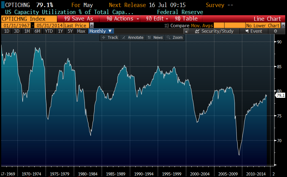 Industrial Production increased .6% in May. Capacity Utilization rose to 79.1% and Manufacturing production rose .6%. April’s numbers were revised upward. Durable goods production was up 5.3% year-over-year.