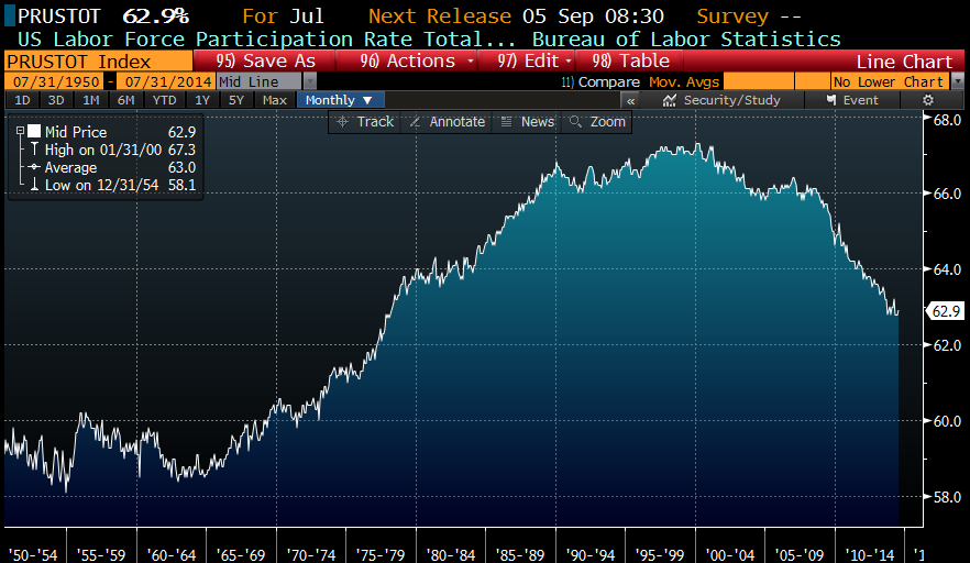 Still, we aren’t going to see a robust economy until the labor force participation rate gets back to normal levels. As you can see from the chart below, about half of the increase in the labor force participation rate that was attributable to women entering the workforce starting in the 1960s has been given back. That low number represents excess capacity that isn’t being captured with the headline unemployment number. Which is why wage growth is so hard to come by (the other reason being technology).