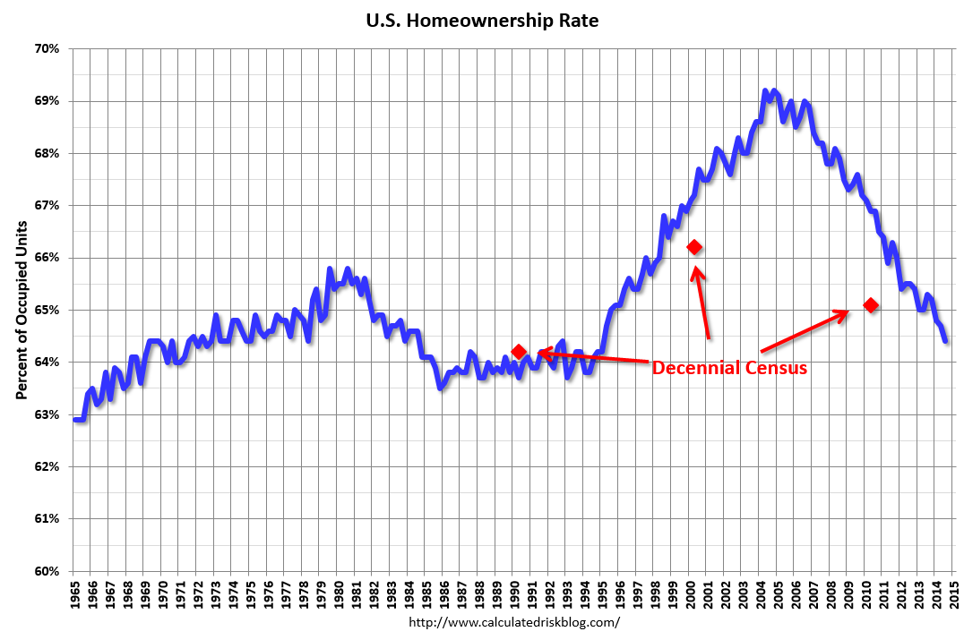 The homeownership rate ticked down in the third quarter from 64.7% to 64.4%. Household formation was roughly flat. We are pretty much back at levels not seen since the Clinton Administration began its big push to increase home ownership early in its administration.What is going on? Tight credit and a weak labor market is keeping the Millennial generation renting instead of buying. Median asking rents continue to rise and are now around $756. The P&I payment on the median house versus at the current 30 year fixed rate with 20% down is $796.