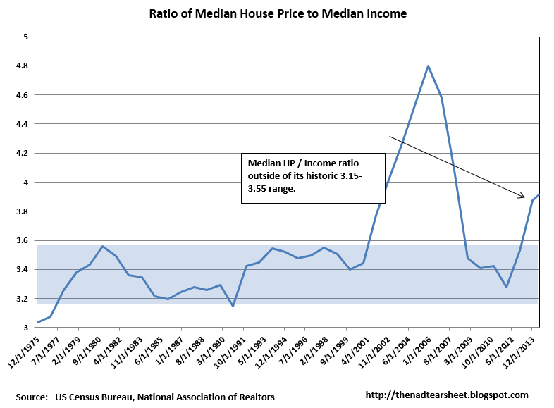 The median home price to median income ratio is now 209,700 / 53,589 = 3.9x. Historically, that number has been in a range of 3.2 – 3.6. So house prices could be vulnerable or stagnate until we start seeing wage inflation.