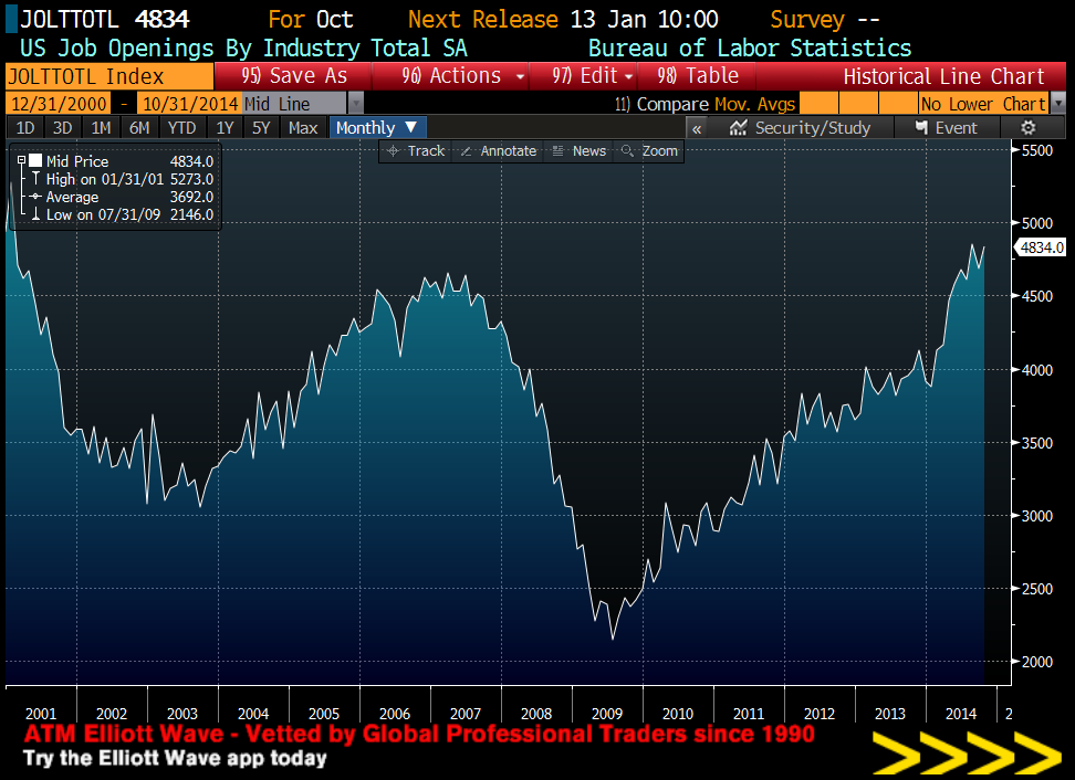 Another good data point for the market: Job openings rose to 4.834MM in October from 4.685MM in September. This almost matches August’s number, which was the highest since early 2001. Combine that with a steady diet of sub 300k initial jobless claims prints and the leading indicators of the labor market are looking strong. Now about that wage growth…