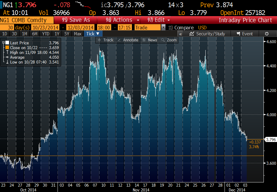 From the polar vortex making November the coldest in decades to El Nino ushering in a mild December, natural gas investors have been taken for a ride over the past six weeks or so. Fun fact – on the NYSE, they have Bloomberg or CNBC on the big TV monitors. In the commodity pits, they have on the Weather Channel. This is why. Look at the volatility of nat gas over the past month. roughly $3.50 to $4.50 and back to $3.80. Pretty amazing.