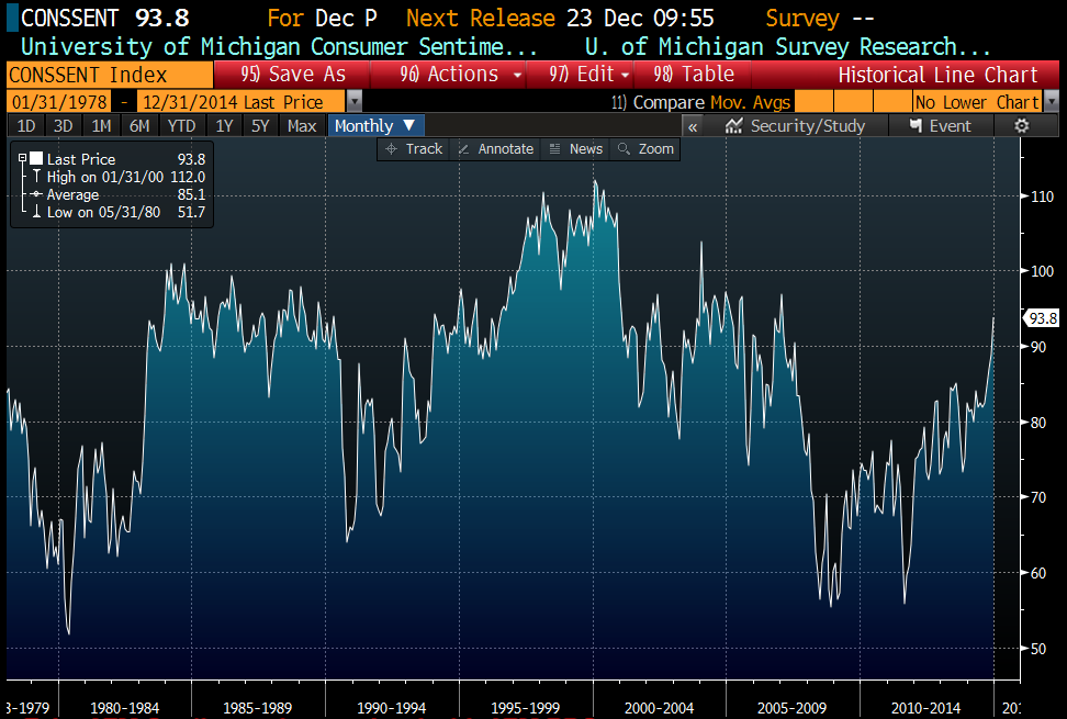 Declining gas prices pushed the University of Michigan Consumer Confidence level to 93.8 from 88.8 last month. We appear to be back to normalcy.