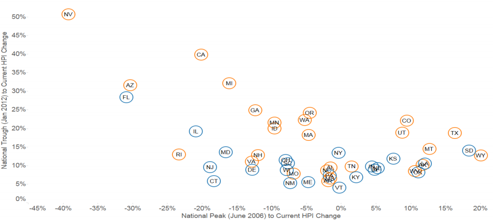 The latest Black Knight Mortgage Monitor is out. Foreclosure starts dropped by 10.5% to 81,400 and the foreclosure inventory dropped to 3.6MM homes, which is down 18% year-over-year. They have a cool chart that illustrates the difference between the judicial and non-judicial states in terms of home price appreciation, both in terms of decline and rebound. You can see how the judicial states have experienced much lower rebounds off the bottom than the non-judicial states. It would be interesting to see compare the peak to trough price declines of judicial vs. non-judicial states. I suspect we would find that having tougher foreclosure requirements did not help support house prices.