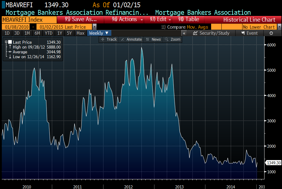 Mortgage Applications rose 11.1% last week, with purchases rising 4.5% and refis increasing 16%. The refi index is bouncing back from a highly depressed Christmas week level, so don’t break out the champagne quite yet. That said, the last time rates were around here, home prices were a lot lower. Cash out refis to pay down credit card debt and HELOCs will be attractive to many borrowers.