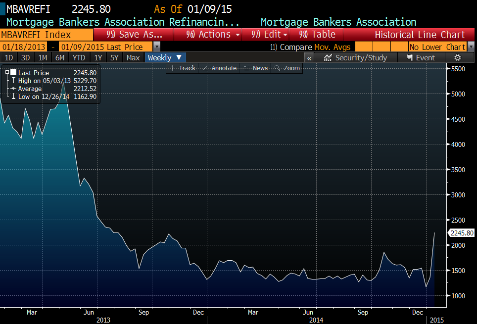 Mortgage Applications rose 49% last week, the biggest gain since 2008. Rates are the lowest since May 2006, and refis soared. Of course we are coming off of a holiday shortened week, but the moral of the story is that we might be setting up for another refi wave, this time driven by home price appreciation as well as rates. That said, we have a way’s to go to get back to the salad days of early 2013, but this is an encouraging number nonetheless.