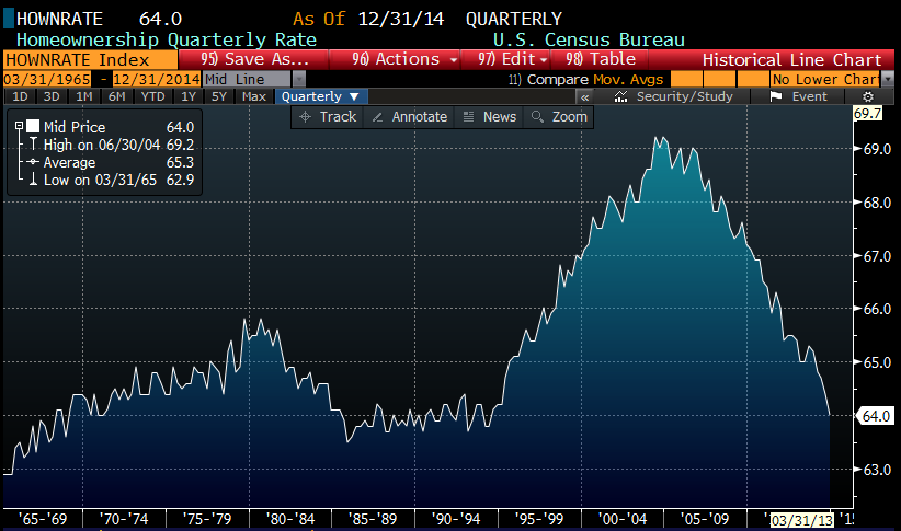 The NY Times comments on the social engineering aspects of the housing market. Note that one of Bill Clinton’s first acts was to prod Fan and Fred into increasing the homeownership percentage. That percentage is now back to 1994 levels more or less. Mel Watt is trying to push it up again, but really has limited tools given that he has to explicitly protect taxpayers and there is still not much of a private mortgage market.