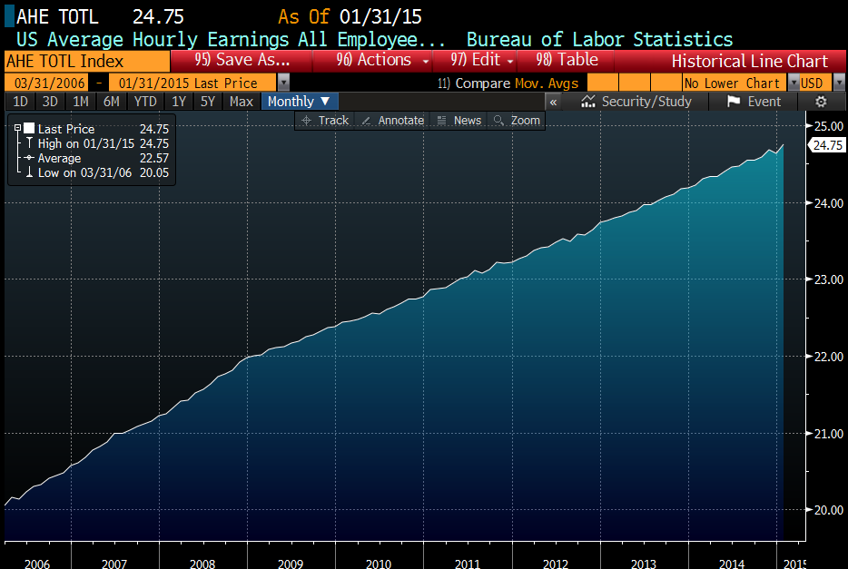 Lots of important economic data this week, but the jobs report on Friday will be the highlight of the week. Bond Markets will be focused on average hourly earnings. Below is a chart of average hourly earnings. Note the change in the slope of the line starting in 2009. That is a change from roughly 3.2% annual growth to 2% annual growth, which is more or less in line with inflation. Later on this week, we will get non-farm productivity, which is expected to fall, and unit labor costs which are expected to increase 3.3%.