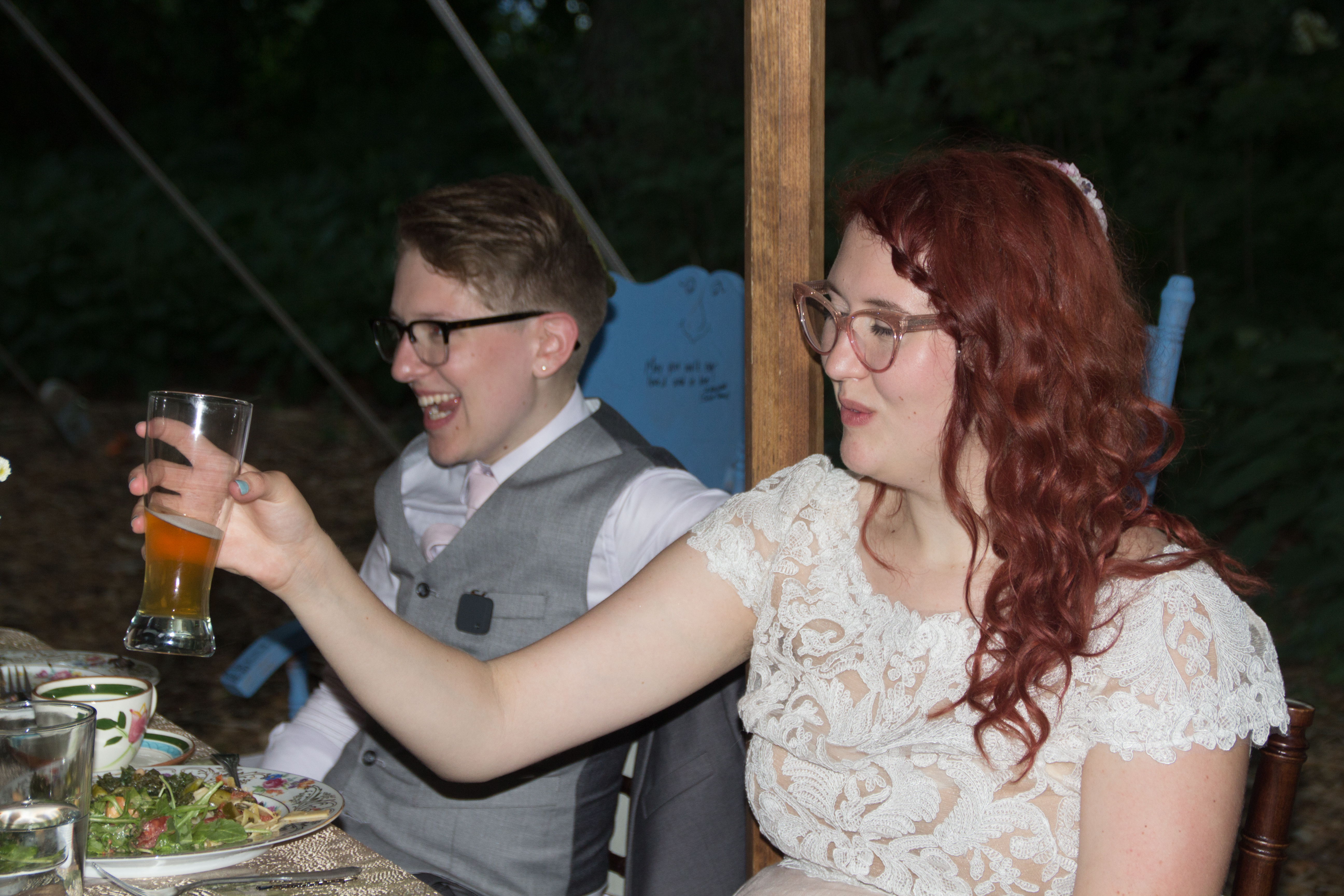 Bride A was dressed in a homemade ivory linen dress with pink flowers in her hair to match her cateye vintage style glasses. Bride B wore gray slacks with a matching vest over a light blue shirt and pink tie. Over her shortly cropped hair she wore a large leaf reminiscent of a yarmulka. The male members of wedding party (the entire wedding party was described as Friends of Honor as oppose to the more common groomsman/bridesmaid designations) had full beards and wore suspenders making them look like hipster artisanal pickle merchants. Even the band had a certain turn of the century look. In some respects the whole event had the vibe of a community theater production of Yentl.