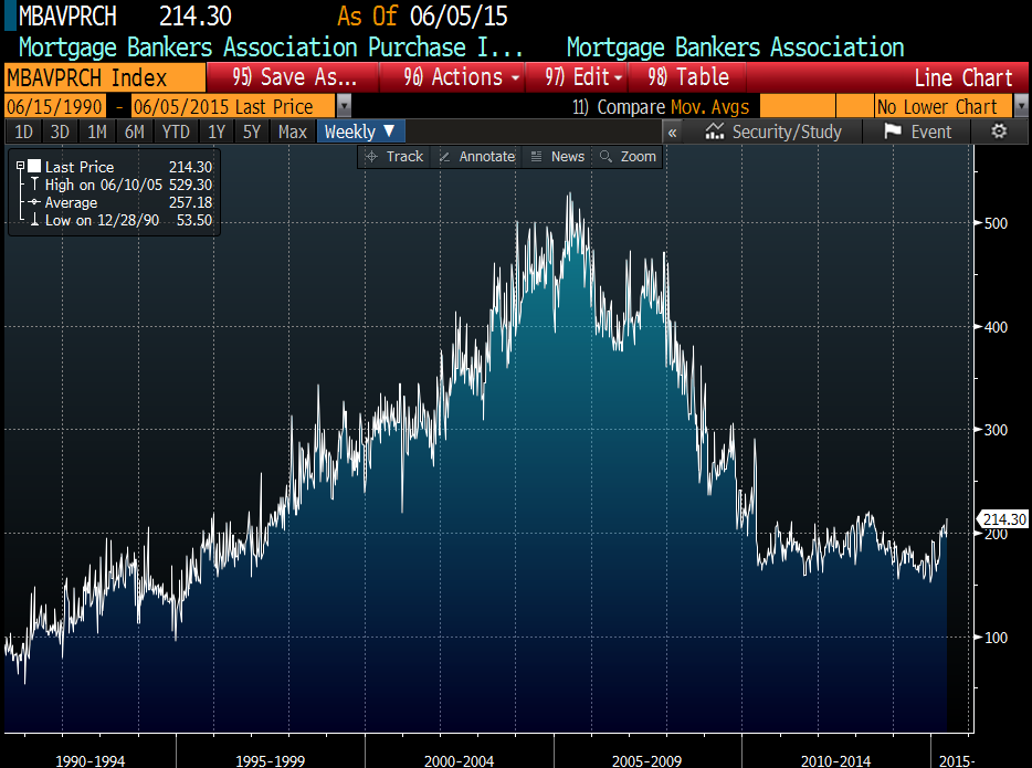 Mortgage Applications rose 8.4% last week in spite of a massive sell-off in bonds, which took the 30 year fixed rate mortgage from 4.02% to 4.17%. Purchases were up 9.7% while refis increased 7%. Note that this bump is following the shortened Memorial Day week, so that accounts for some of the increase. The purchase index is approaching 2 year highs, although we are a long way from normalcy.