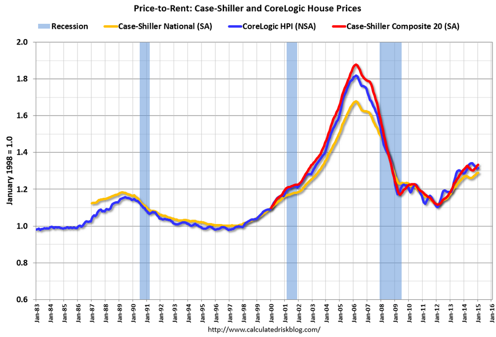 While home prices still remain affordable compared to the bubble years, low inventory has pushed up the price / rent ratio. We are back to late 2003 levels. On a nominal (in other words, non-inflation adjusted basis), prices are approaching peak levels, but on an inflation adjusted basis, they still have a ways to go. Of course wage inflation remains muted, so that will act as a drag on home price appreciation, or at least affordability.