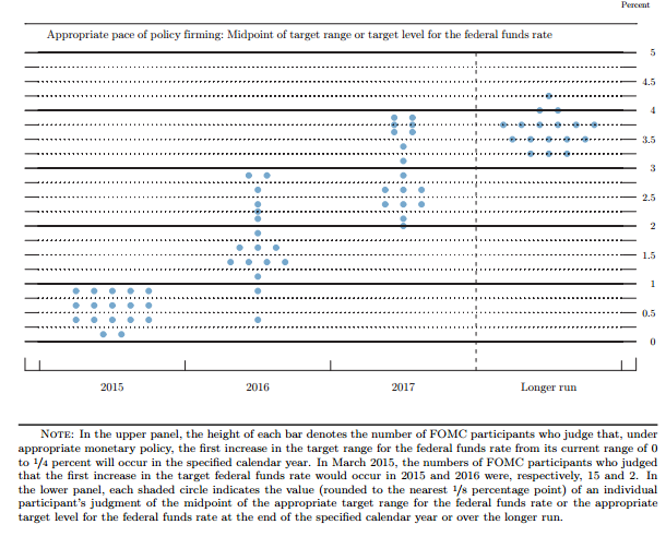 You can see from the dot graph from the June meeting that the FOMC is forecasting a slower liftoff, however we are still looking at a 350 basis point (roughly) tightening vs the 425 basis point tightening in 2004, which blew up the residential real estate bubble. Will this tightening campaign blow up the sovereign debt bubble? Or something else?
