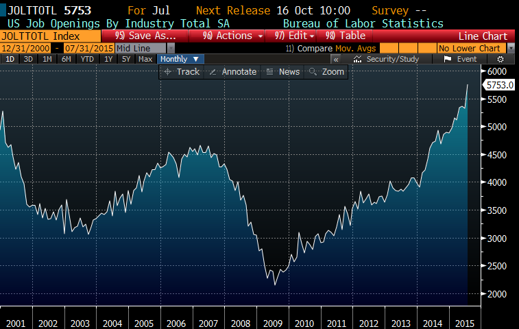 Job openings hit a record in July, with the JOLTS job openings hitting 5.7 million. Compare that number with the number of unemployed at 8 million. The quits rate (which is a measure of economic strength) has been unchanged for the past year however at between 2.7 million and 2.8 million. It seems surprising to see a labor force participation rate at 38 year lows, job openings at highs, an unemployment rate at boom time levels, and almost no real wage growth. It speaks to a mismatch between what business wants and who is available.
