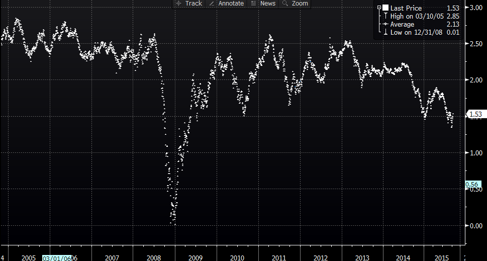 The latest Fed model has the US using up its resource capacity by the first quarter of 2016. The markets and the Fed have been predicting diametrically opposed outcomes. So far, the markets have been correct. Below, is a chart of the implied inflation rate using the prices of Treasury Inflation Protected Securities. The implied inflation rate has fallen by 100 basis points over the past 2 years.