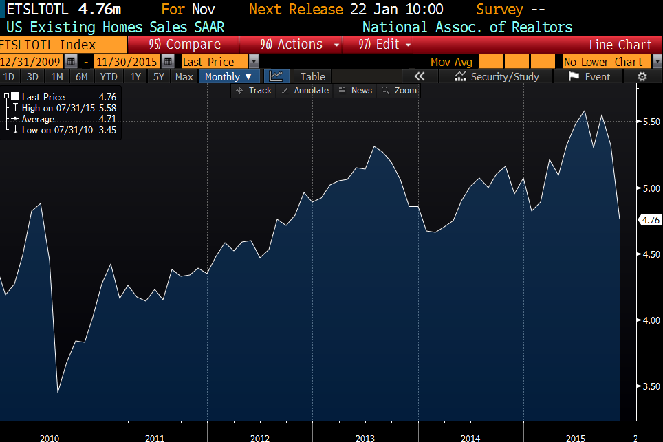 Existing Home Sales fell by a lot yesterday, which was largely attributed to TRID issues. Look at the chart – biggest drop in a long time – certainly since 2010 when the homebuyer tax credit expired.