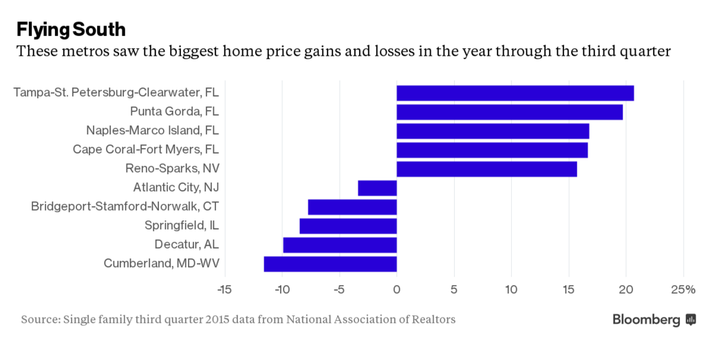 Know what did work in 2015? Real estate. Speaking of which, here are the hottest real estate markets according to NAR. As expected, the Bay Area tops the list, and California urban areas are well represented. Know what didn’t work in real estate? The stocks of companies in real estate with names like Stonegate and Nationstar in the dumps.
