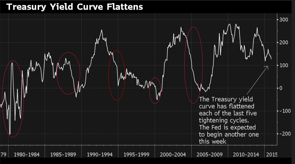 As a general rule, in credit crunches, the long bond rallies. You saw that on Friday, where the 10 year yield fell 10 basis points in spite of strong retail sales data. This week will be interesting between the evolving Third Avenue situation and the FOMC decision on Wednesday. LOs, expect bond market volatility this week. As a general rule, tightenings have not had a dramatic effect on mortgage rates. In fact, the yield curve has flattened during all the tightening cycles since 1979. Granted, these tightenings have taken place in context of a secular bull market in bonds, so take this analysis with a grain of salt. That said, unless the economy really starts taking off (and you start seeing wage inflation), chances are that the 10 year yield increases less than the amount of the rate hike. Note that CoreLogic is forecasting a 4.5% 30 year fixed rate mortgage by the end of 2016.