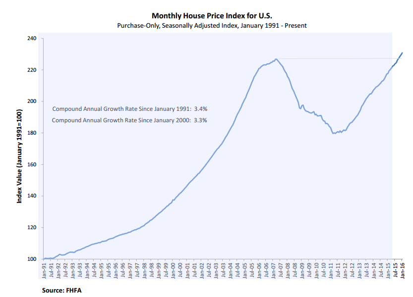 The FHFA House Price Index rose 0.5% last month. House prices have recouped all of their losses from the housing bust and are making new highs. Note the FHFA House Price Index is the only one showing the losses have been recouped – Case Shiller, and Core Logic have not.
