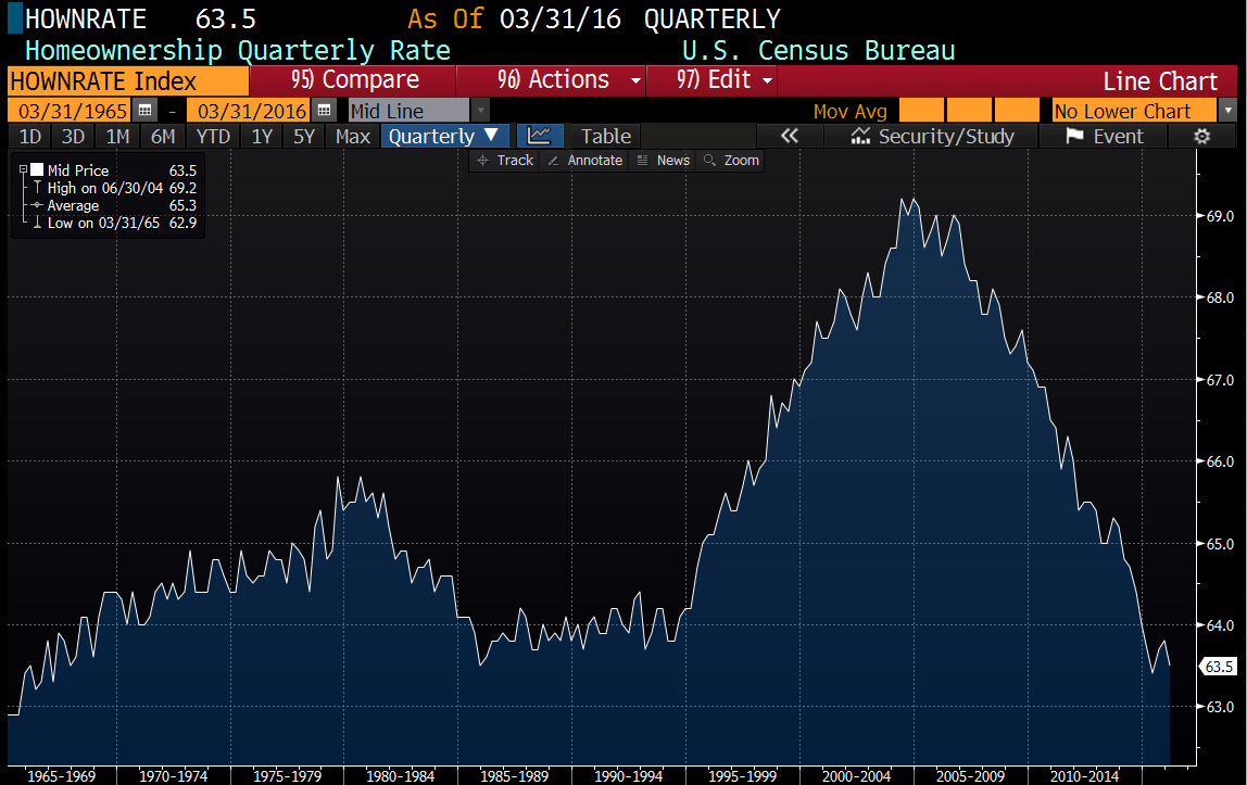 The homeownership rate fell to 63.5% in the first quarter, which is back below the levels of the mid 80s through the mid 90s. The gains in homeownership that started with the Clinton Administration’s social engineering via the housing market in 1995 have been given back.