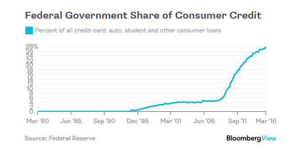 Interesting chart about the Federal government’s percent of ownership of consumer debt. This is money that US citizens owe Uncle Sam. Ever since Obama nationalized the student loan sector, they have taken their percentage of consumer debt from 5% to 28%. The student loan market is a $1.3 trillion market – not exactly chump change. Expect some sort of write-down of student loan debt in the future: many graduates have degrees that will never pay enough to work this down. As a side note, more young adults aged 18-34 live at home with Mom and Dad than in any other arrangement.