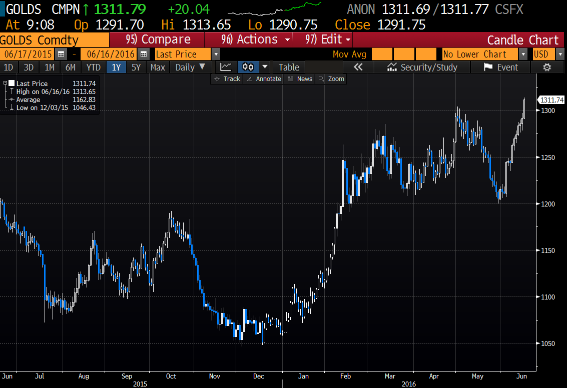 The other beneficiary of negative interest rates? Gold, which has been on a tear lately. The knock on gold has always been that it has no yield. No yield is better than negative yields, and gold has upside, while there probably isn’t much upside in a government bond with a negative yield. A rule of thumb for gold has always been that an ounce of gold should buy a high quality men’s suit.