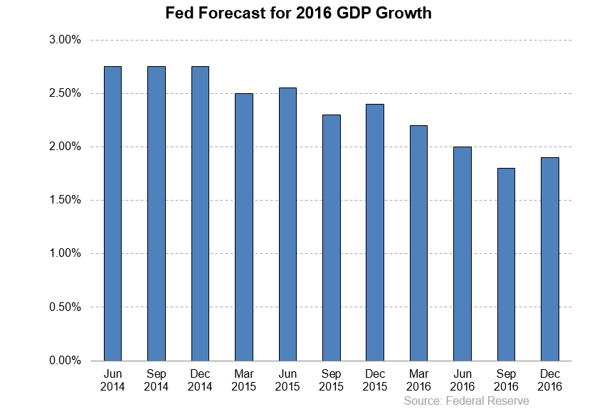 Note that the Fed has been consistently high in its estimates for GDP growth. The chart below looks at the Fed’s forecast for 2016 GDP growth at different points in time, starting with the June 2014 estimate.