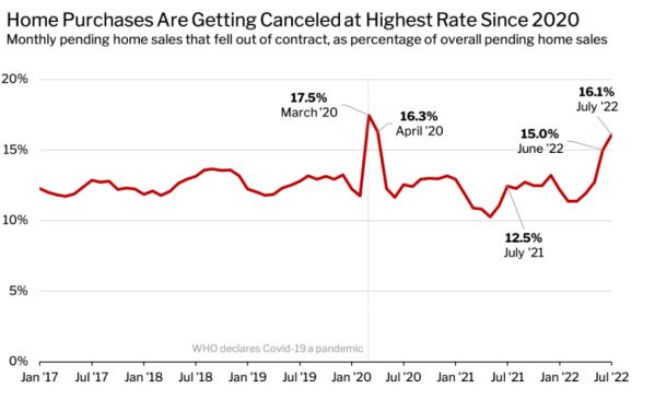 Homebuyers are beginning to get the negotiating leverage in deals, at least according to a new report from Redfin. Home purchase contracts were canceled at a 16.1% rate in July, which is almost as high as the early days of the pandemic, and much higher than pre-pandemic. “Homes are sitting on the market longer now, so buyers realize they have more options and more room to negotiate. They’re asking for repairs, concessions and contingencies, and if sellers say no, they’re backing out and moving on because they’re confident they can find something better,” said Heather Kruayai, a Redfin real estate agent in Jacksonville, FL. “Buyers are also skittish because they’re afraid a potential recession could cause home prices to drop. They don’t want to end up in a situation where they purchase a home and it’s worth $200,000 less in two years, so some are opting to wait in hopes of buying when prices are lower.”
