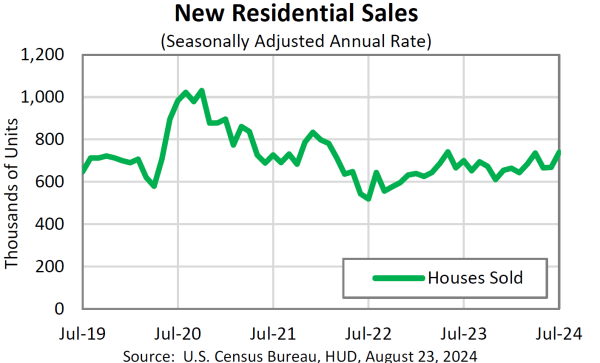New Home sales rose by more than expected in July, increasing 10.6% to a seasonally adjusted annual rate of 739,000. This is still down about 5.8% compared to last year.