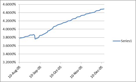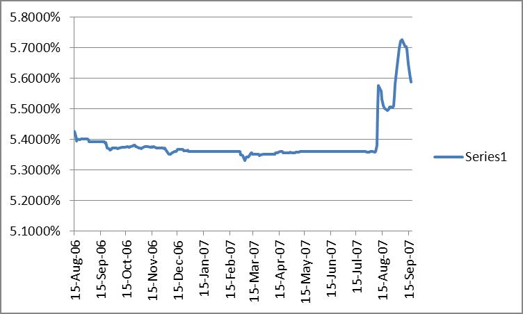 In looking at the data, one interesting thing appears immediately.   For almost an entire year, from mid-September 2006 until mid-August 2007, the daily LIBOR quote barely moved at all.