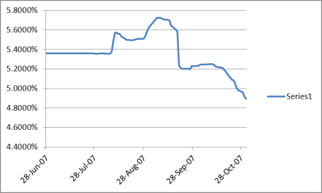 In fact what we see is remarkable consistency.  Indeed, for two extended periods, from Dec 26, 2006 until February 27, 2007, and then again from May 10, 2007 until July 26, 2007, we saw quite literally not a single change in the daily LIBOR rate of 5.36%.  For these two periods the graph is a perfectly flat line.